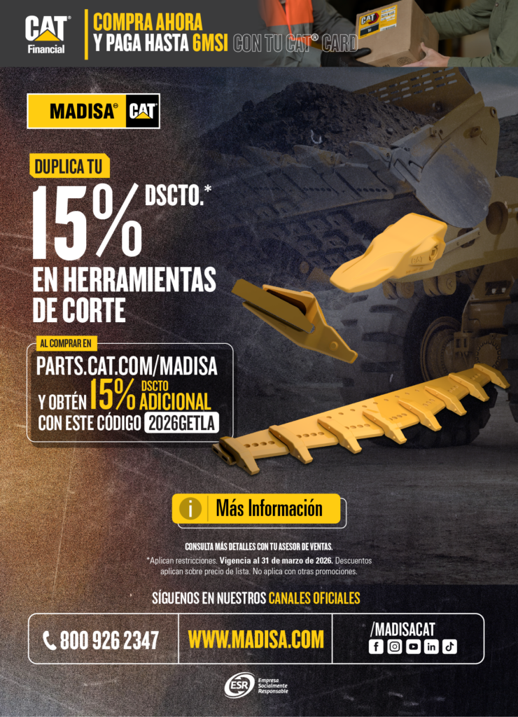 ¡Aprovecha un 15% de descuento extra en herramienta de corte al comprar en línea en parts.cat.com/MADISA con el cupón: 2026GETLA
