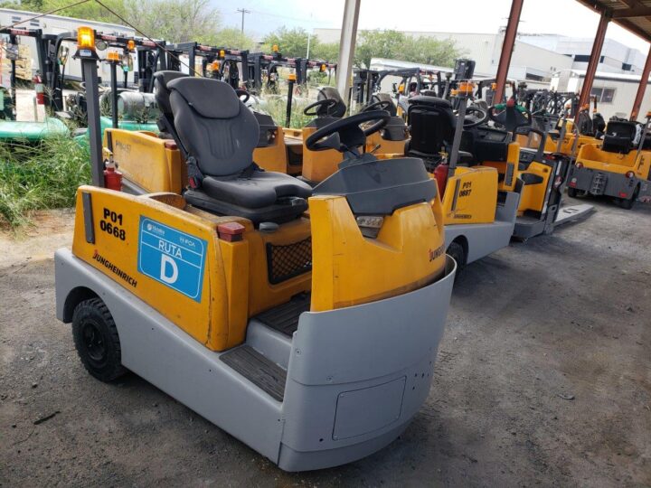 Carretilla de arrastre, Eléctrico 48 volts, capacidad de remolque 15,400 lbs, barra de tiro, control de velocidad electrónico, ejes delanteros y traseros para interiores, llantas sólidas. Peso de operación 2,778 lbs. Batería incluida modelo 24-D85-07, ID P008202A.