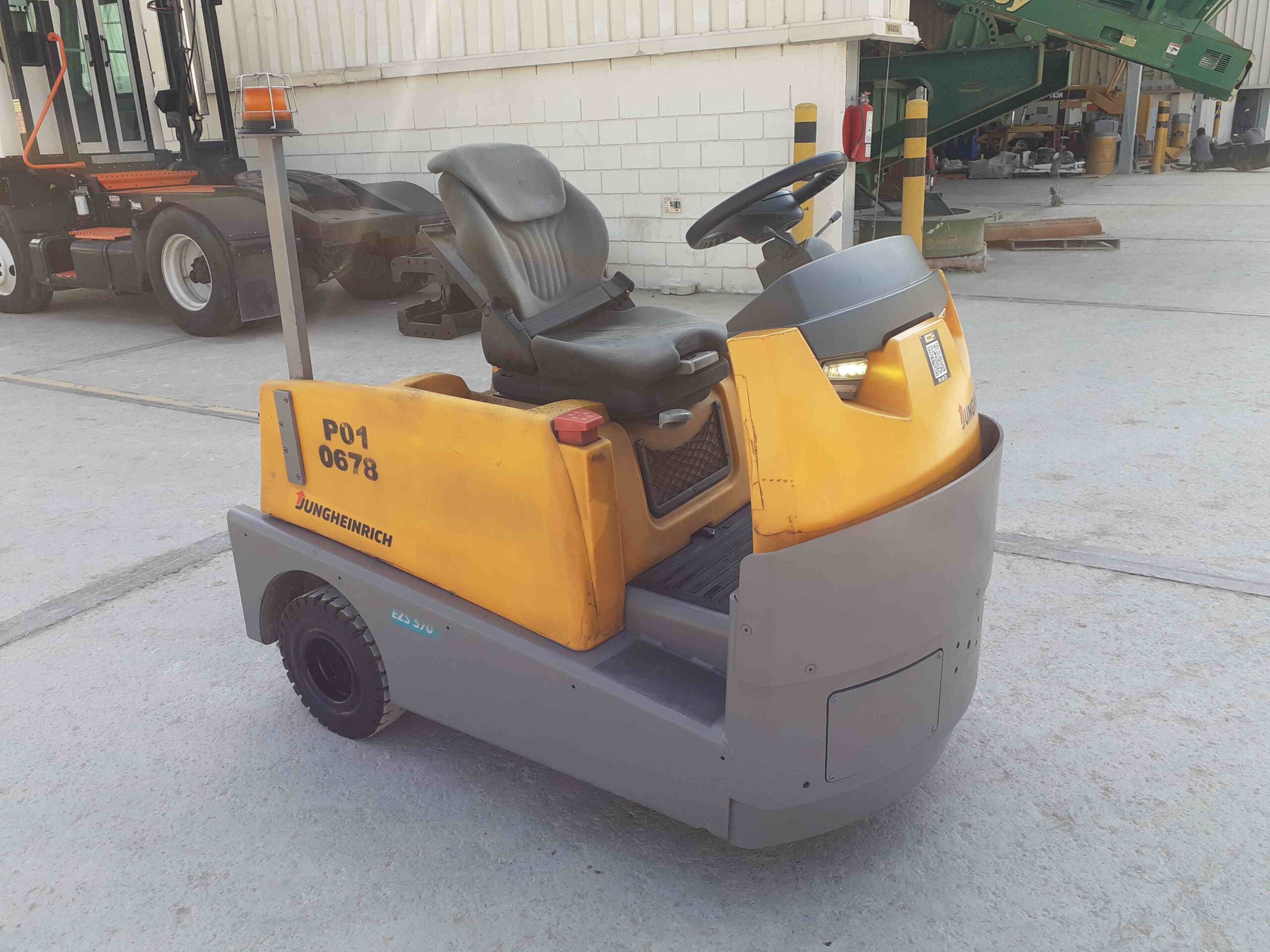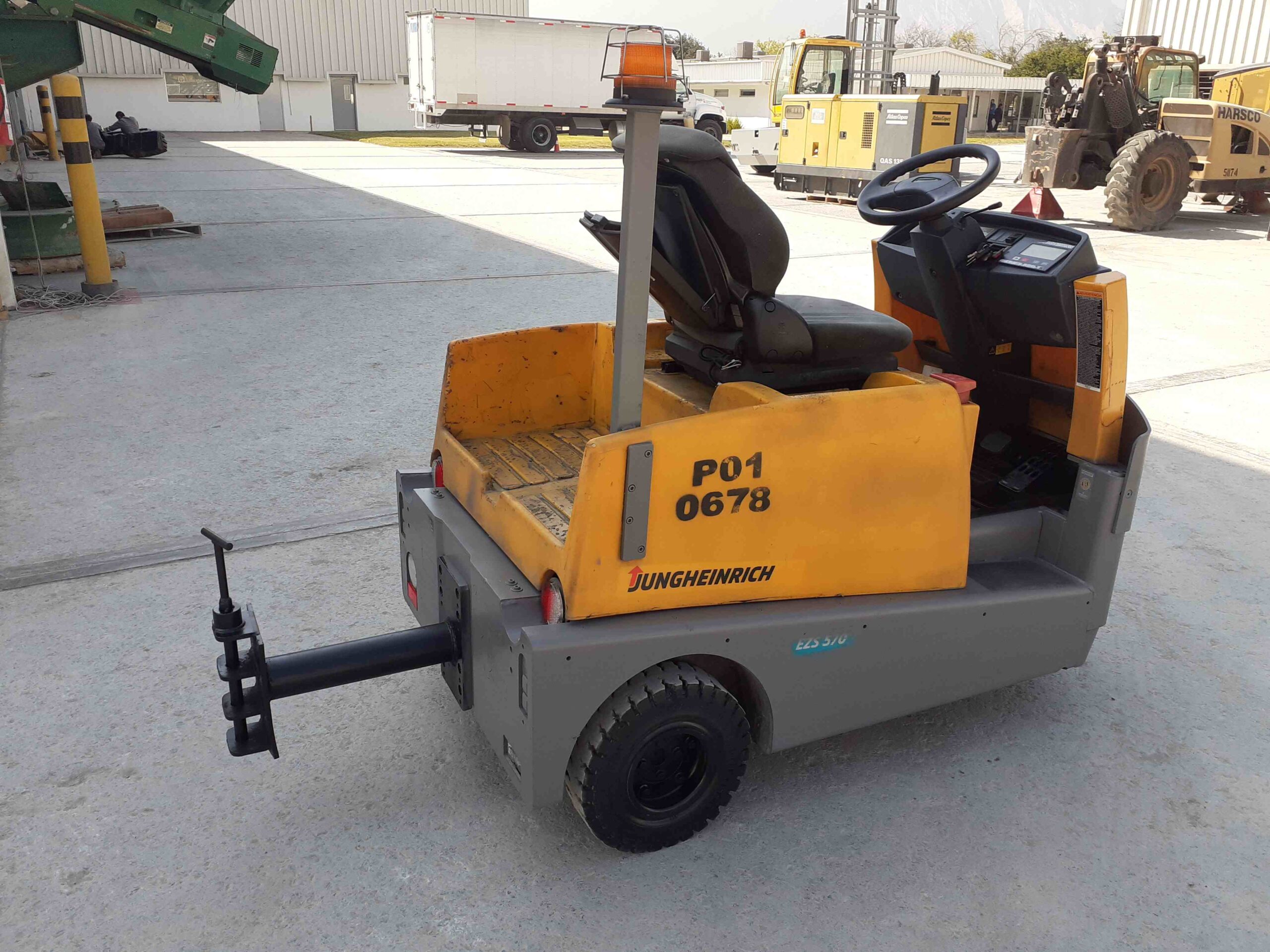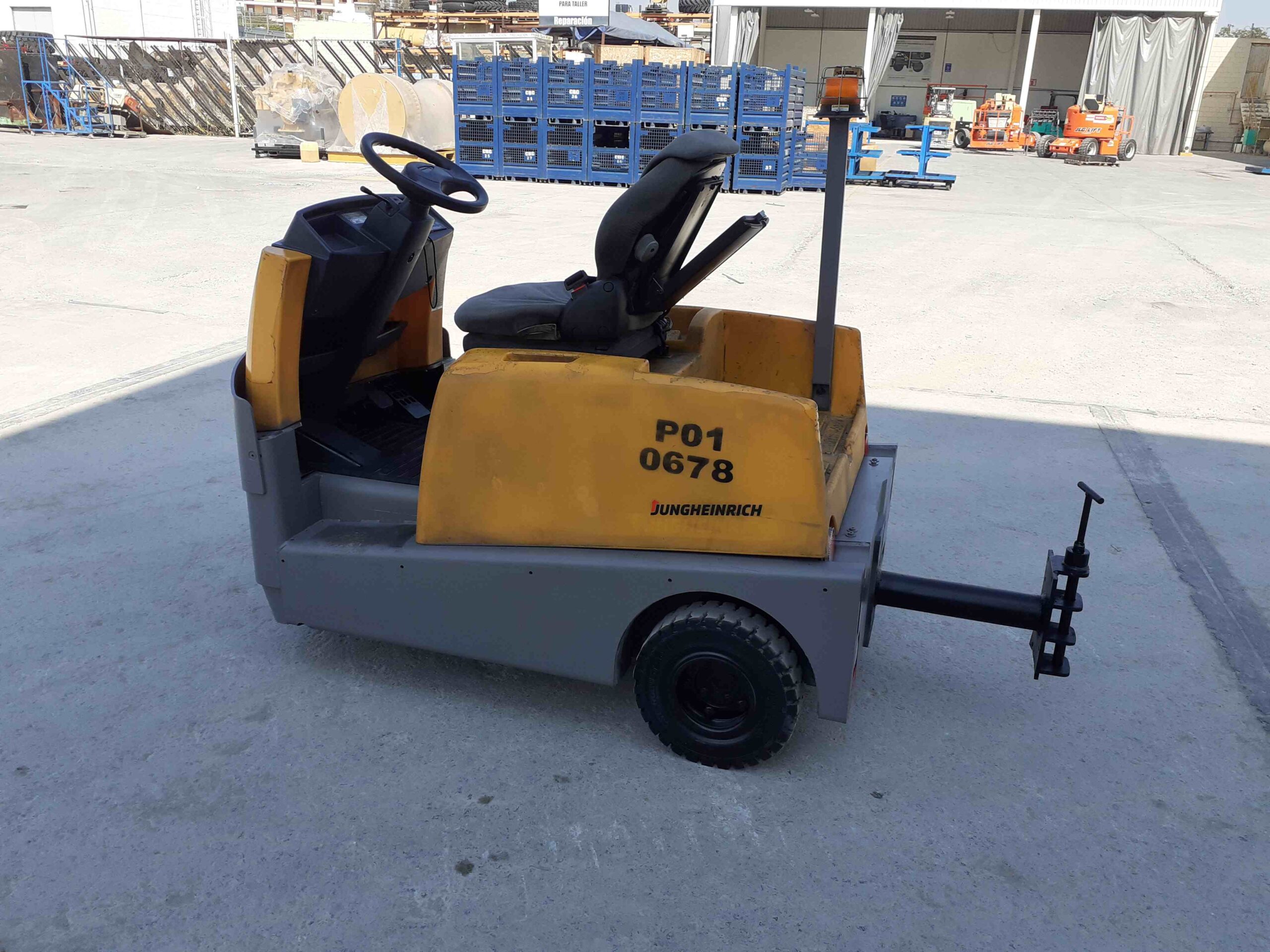 Carretilla de arrastre, Eléctrico 48 volts, capacidad de remolque 15,400 lbs, barra de tiro, control de velocidad electrónico, ejes delanteros y traseros para interiores, llantas sólidas. Peso de operación 2,778 lbs. Batería incluida modelo 24-D85-07, ID P004855A.