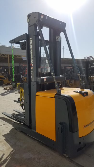 Puesto de operación abierta, mástil triple, palanca de control múltiples, 24V, largo de horquillas 41, llantas solido poliuretano, altura máxima 236 in, capacidad de carga máxima 3,000 lb tipo: eléctrico, hombre parado. Incluye bateria y cargador.