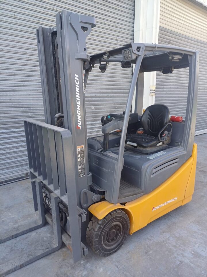 Capacidad de 3,000lbs, Eléctrico de 48V, Mástil triplex con altura de estiva de 188 pulgadas, 3 válvulas, desplazador lateral, Horquillas de 42 pulgadas, Llantas solidas.